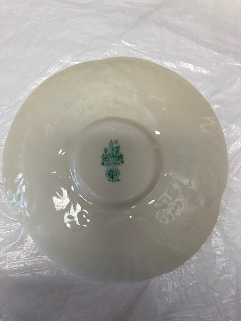 From a retired Private Collection, this Belleek Harp pattern saucer is from an original set. There is a .75" inset for the Tea Cup to rest on the saucer. In the Harp Shamrock pattern, the saucer is 6" round in the shape of a shamrock. The saucer has sprigs of three hand painted shamrocks on the edge of the plate in 3 areas. This set is still handmade in Ireland, yet this set has a 1970 production logo. There is no original box but these pieces will be packaged in a box for safe shipping. This is a great find for the Belleek Collector.