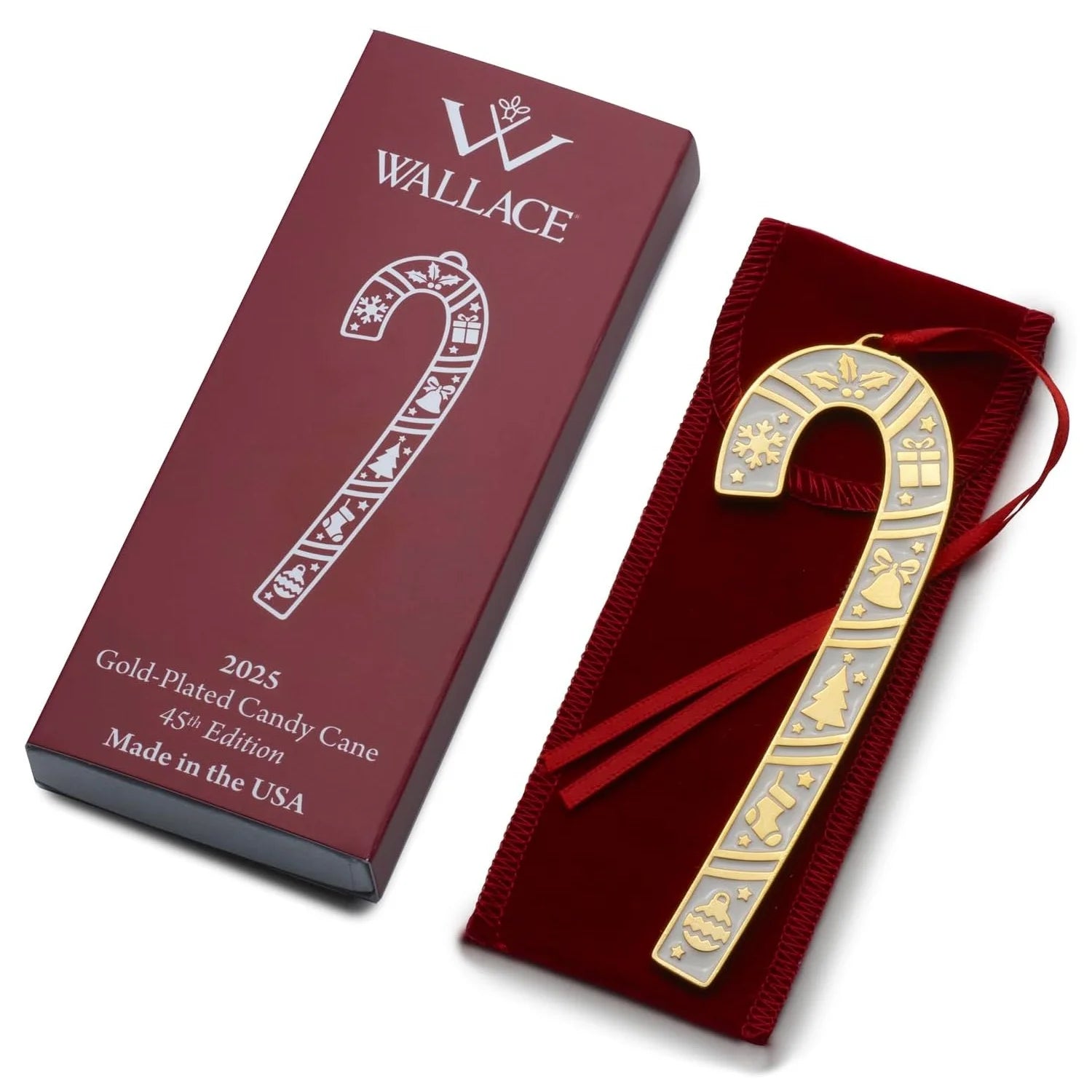 The 2025 Wallace Candy Cane Ornament is the 45th Edition Ornament in this collection. This gold plated, 4.5" in length, Candy Cane Ornament is festive! The Candy Cane is all white with gold accents, Snowflake, Holly, Gift Package, Bell, Tree, Stocking and Ornament! A delightful piece to treasure as a gift. This gorgeous ornament is sure to brighten any holiday decor and will become a keepsake that will be treasured for years to come. This ornament will arrive with a red ribbon, velvet pouch and is nicely gift boxed.