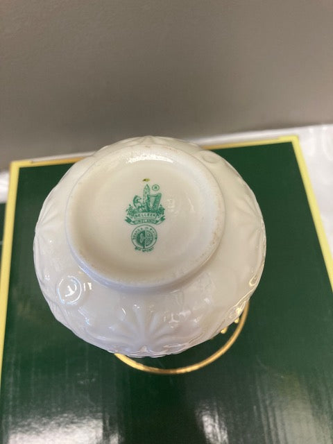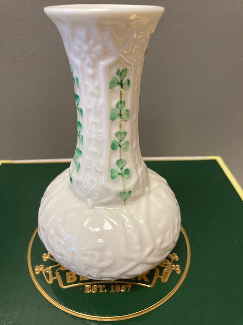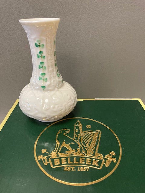 This Belleek China 5" Vase is hand made in Ireland! With a delicate shape, this elegant vase is an original design. There are springs of hand painted shamrocks applied to both sides of the piece to declare the piece as original Belleek Pottery. This piece has a 1960- 1980 stamp. Collect Belleek Shamrock Vases and build a beautiful Collection! This piece is retired and will arrive in the traditional Belleek box.