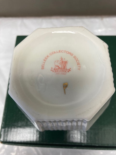 Belleek International Society created this votive for their yearly member.  These votives by Belleek are 4" wide with a gold rim and will arrive with a white candle.  The paticular pattern is contemporary in design with vertical lines in a square shape.  This piece will arrive in white box.