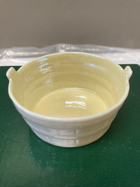 This Belleek China bowl is hand made in Ireland!  This small 2.5" Bushel Basket is retired and is a good find.  With a tiny hole on each side, a thin wire could push through for a handle.  But in this case, the Bushel basket with the inside a lustre yellow and two thin lustre yellow round lines, gives this piece unique charm!  Included, is a small plastic spoon, not Belleek for the extra touch!  This Belleek bowl will make a nice candy dish and will blend well with other Belleek pattern items. This piece will be packaged for safe travels.