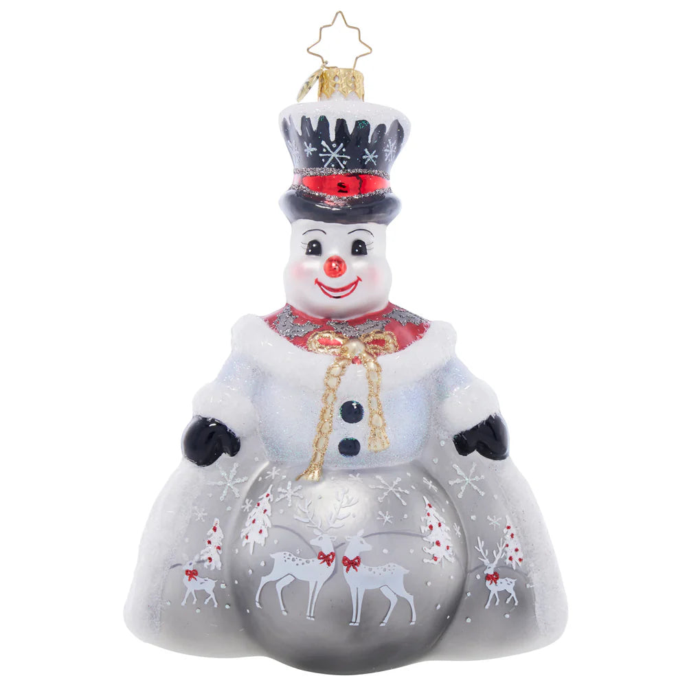 Let it Snow and more "Dressed for Success" Snowman ornaments will appear! This Christopher Radko NEW Snowman is wearing a beautiful red cape decorated in reindeers and snowflakes. Frosted Holly Friends Snowman will sparkle on your tree with class as red trim accents this ornament adding the right mix of colors with a touch of gray. Just a beautiful ornament to add to your tree or to give as a gift!