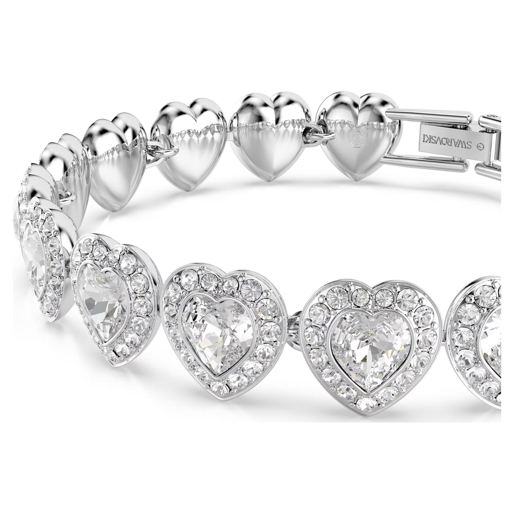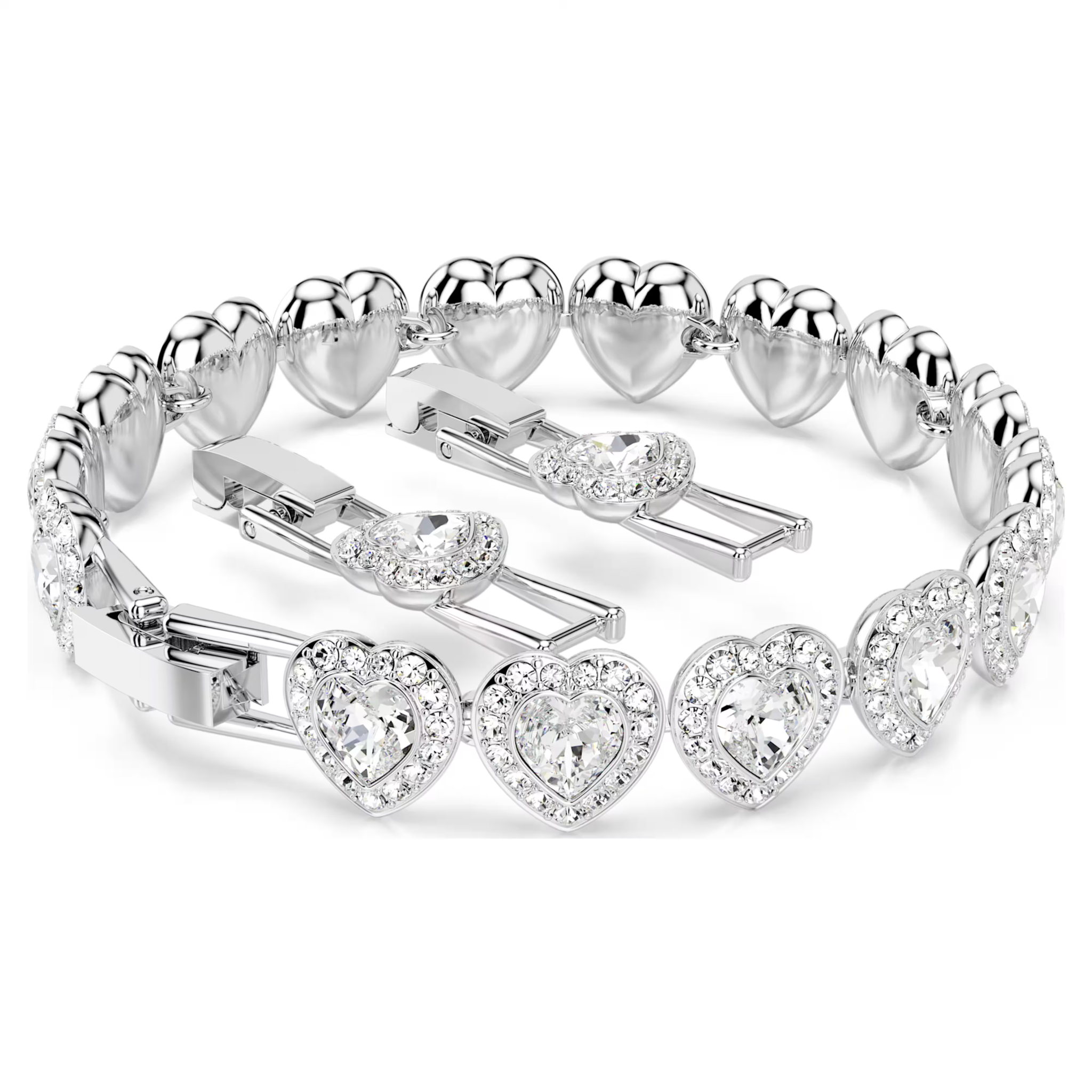 Celebrate love with this stunning Swarovski bracelet from the exclusive Ariana Grande collection. Rhodium-plated and adorned with heart-shaped crystals set in sparkling pavé halos, this romantic piece radiates elegance and sophistication. The adjustable design fits wrists from 6 5/8 to 8 5/8 inches, while the secure fold-over clasp ensures it stays perfectly in place. Mix and match with coordinating pieces to express your unique style. A timeless treasure for those who embrace glamorous romance.